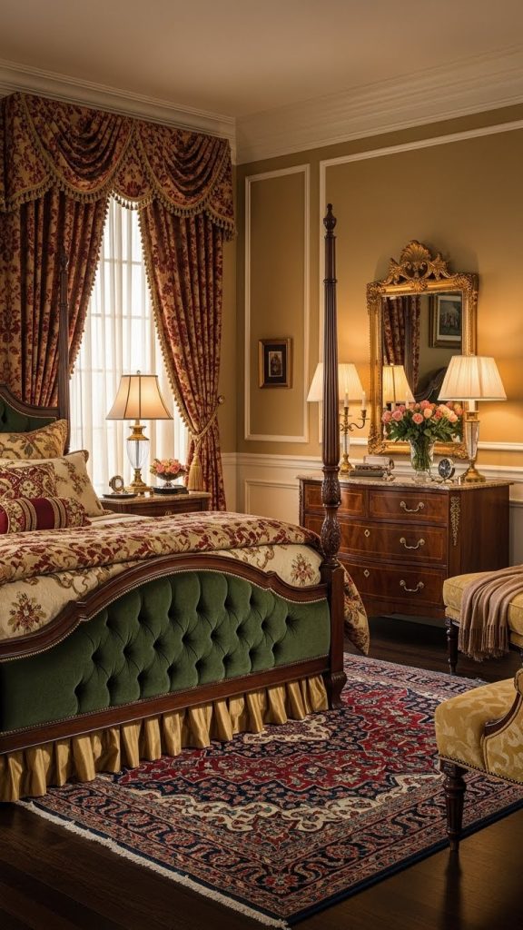 Traditional bedrooms feature classic furniture, elegant details, and rich fabrics. The design feels formal yet comforting.
