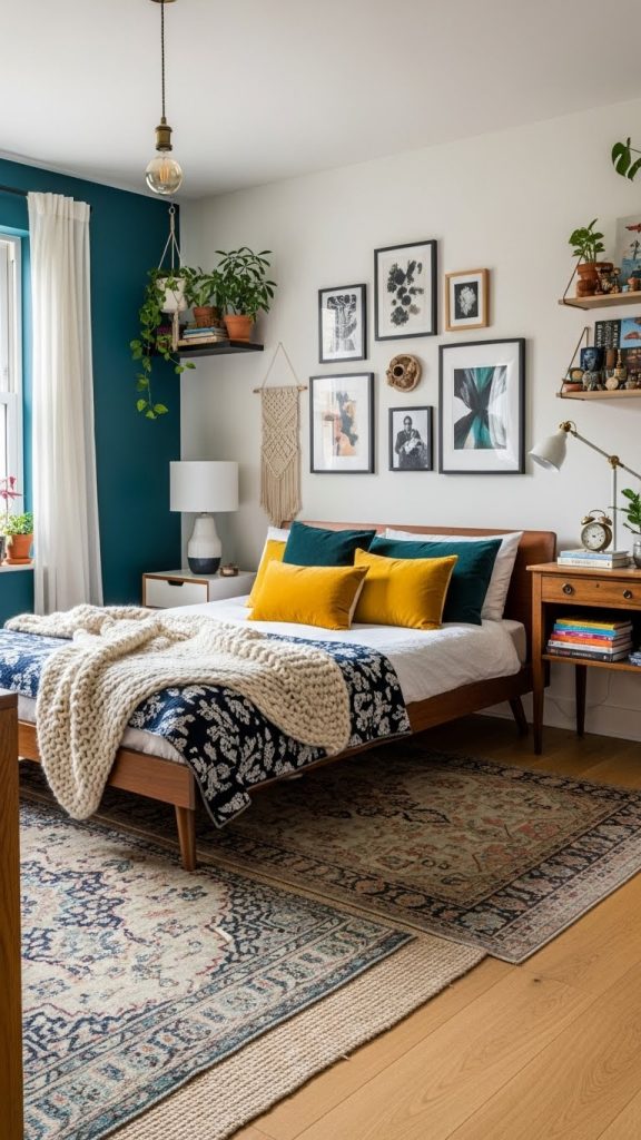 Eclectic bedrooms mix multiple styles, colors, and eras. The key is balance—everything feels intentional rather than random.