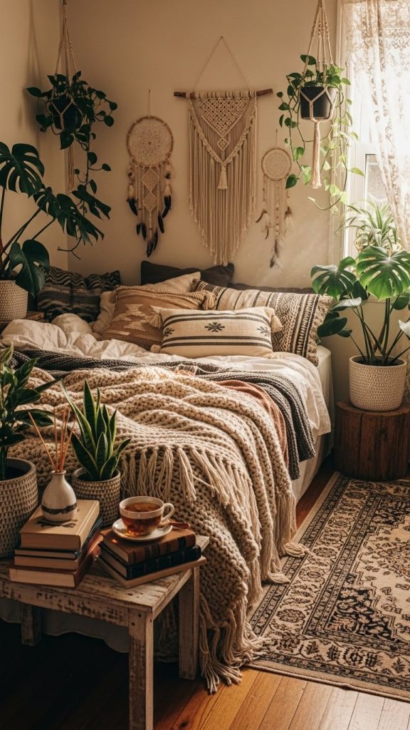 Bohemian bedrooms are creative, relaxed, and full of personality. They feature layered fabrics, earthy tones, plants, and artistic décor.