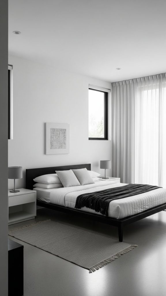 Modern bedrooms focus on clean lines, simple furniture, and a clutter-free layout. The color palette is usually neutral, with blacks, whites, greys, and muted tones.