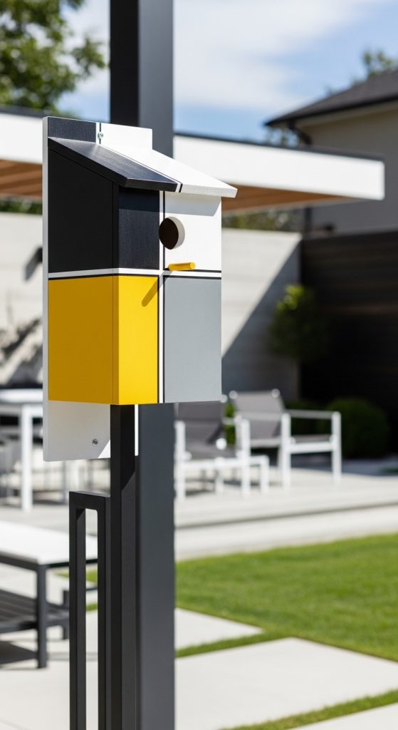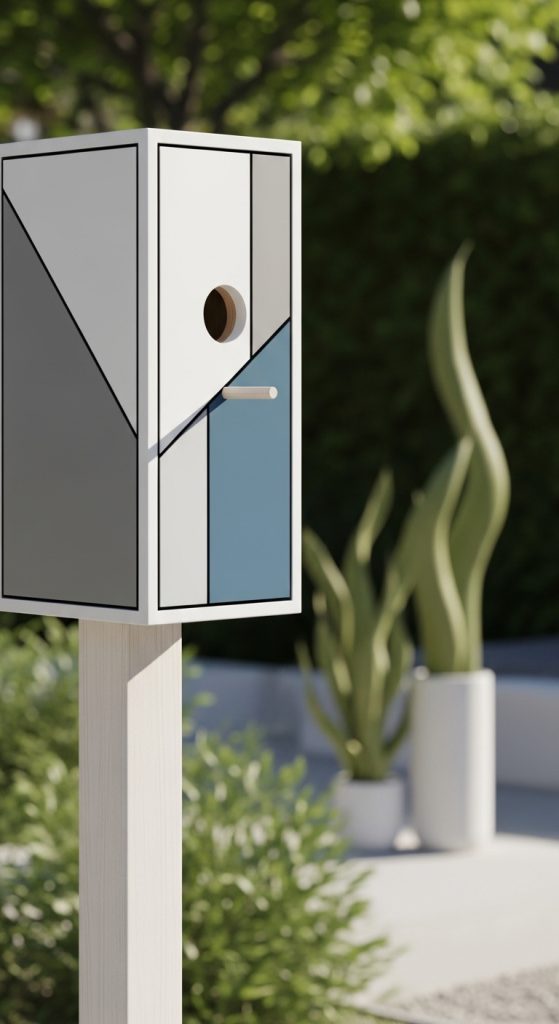 This design style fits well with modern garden aesthetics and contemporary home decor. A minimalist painted birdhouse can complement modern patio furniture, structured garden layouts, and clean outdoor design themes.