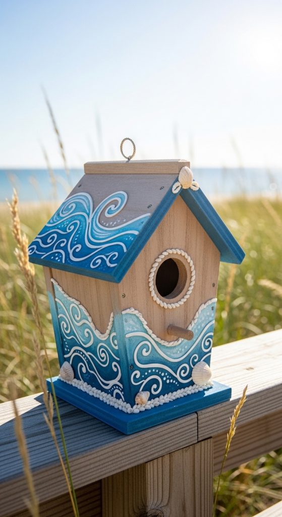 Decorative details such as wave patterns or small shell illustrations can enhance the seaside theme. These elements reinforce the connection between the birdhouse and coastal inspiration.