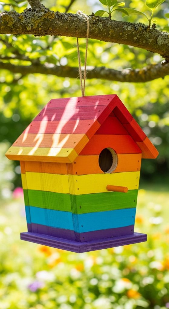A rainbow painted birdhouse focuses on using multiple bright colors to create a vibrant outdoor decoration. Rainbow color patterns are commonly used in creative DIY projects because they introduce strong visual contrast and playful energy. This design style works particularly well in gardens with colorful flowers or playful outdoor themes.