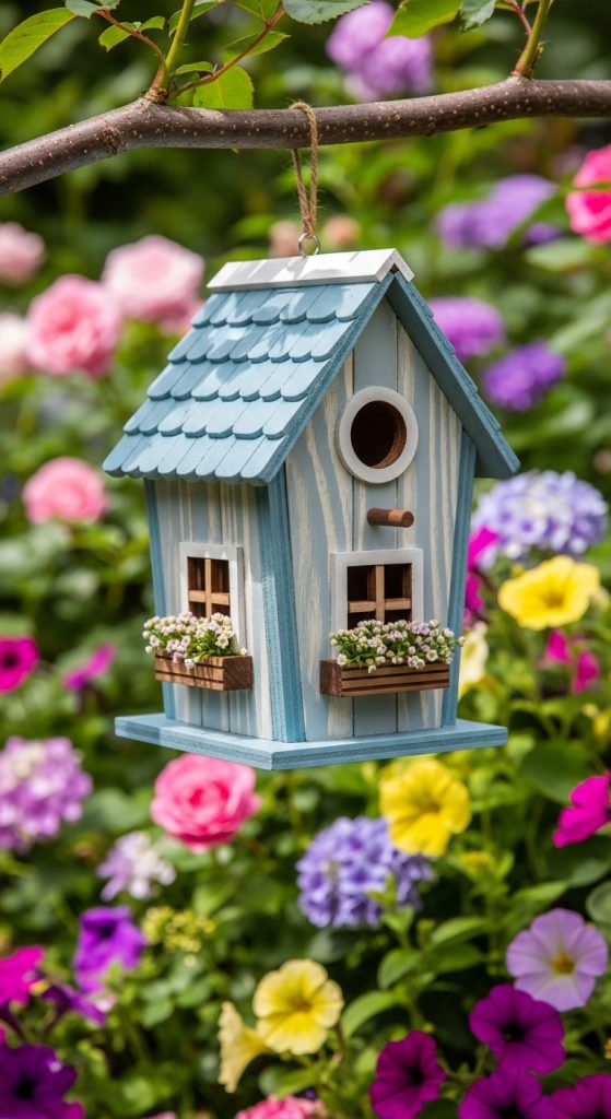 A garden cottage birdhouse design focuses on creating a charming miniature house appearance. This painted birdhouse style reflects traditional garden cottages often seen in countryside landscapes. The design typically includes soft color palettes, painted windows, and decorative trim that make the birdhouse resemble a small cottage structure.