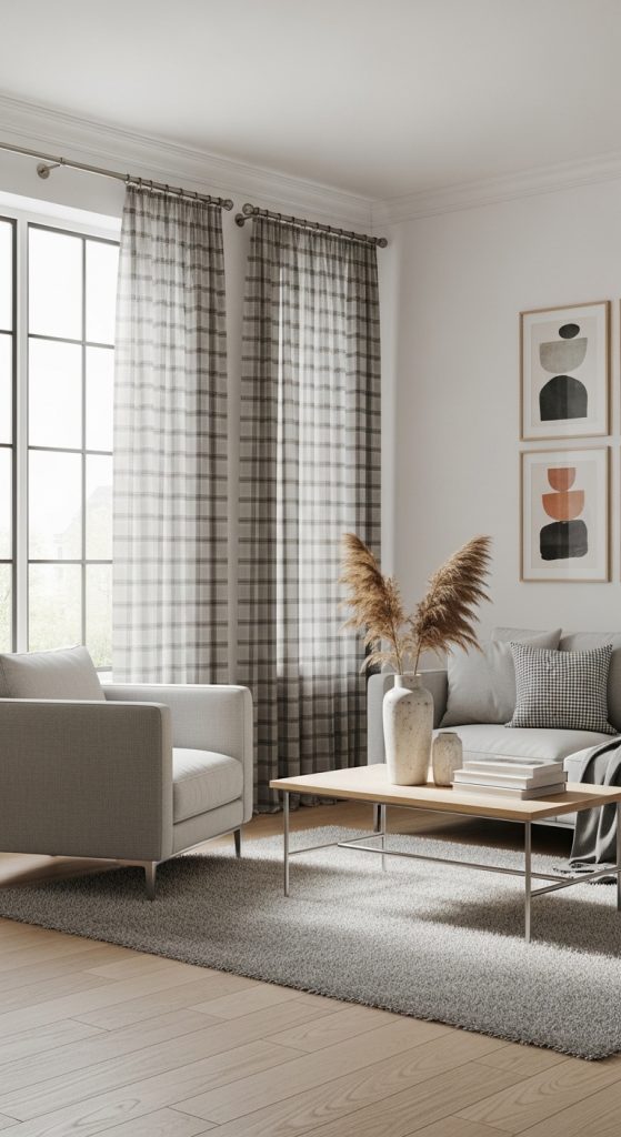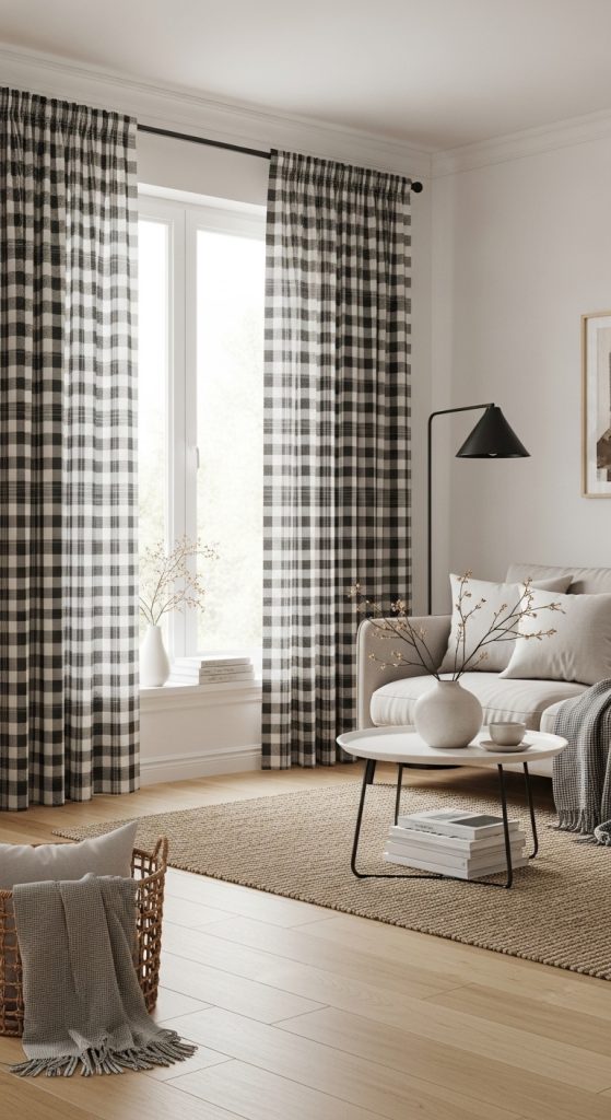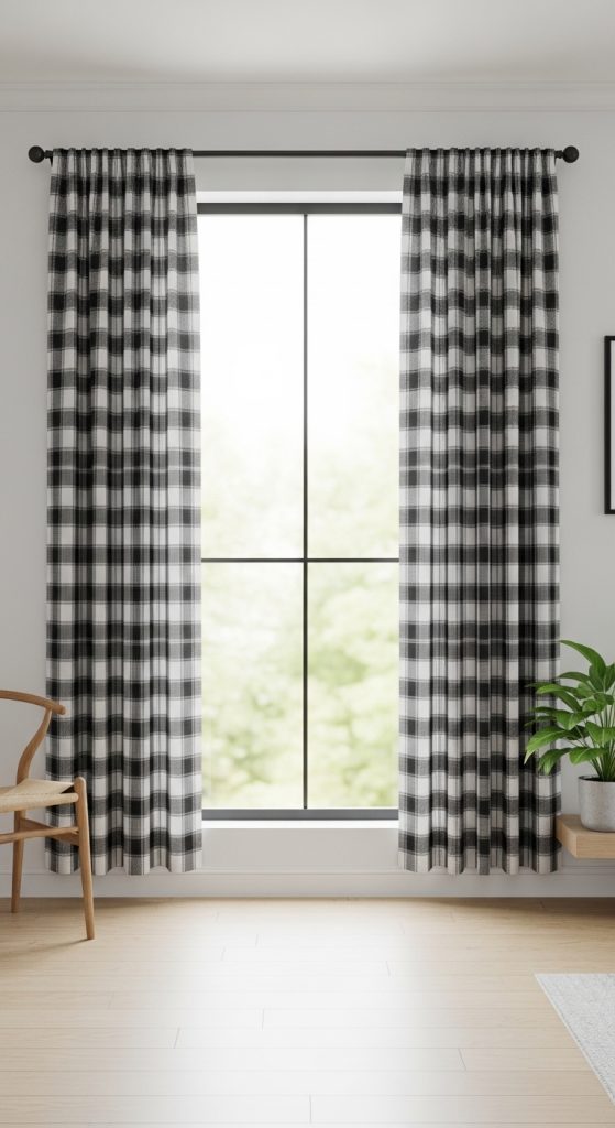 Black and white plaid curtains continue to trend in Pinterest inspiration because they combine simplicity with strong visual definition. The pattern creates structure without overwhelming the space, making it suitable for a wide range of interiors. The neutral color scheme allows these curtains to blend easily with existing decor while still acting as a focal point.