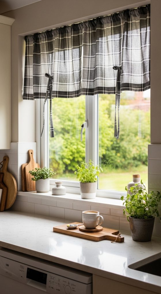 Idea 2: Short Plaid Curtains for Kitchen Windows