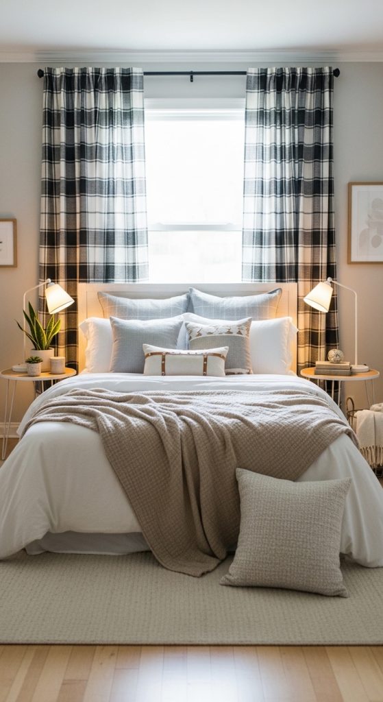 Full-length plaid curtains provide privacy and light control in bedrooms. The pattern adds visual interest while maintaining a calm atmosphere.