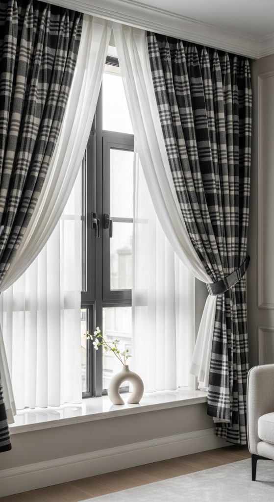 Layering black and white plaid curtains with sheer panels adds depth and flexibility. The sheer layer allows light to pass through, while the plaid curtains provide privacy and structure.