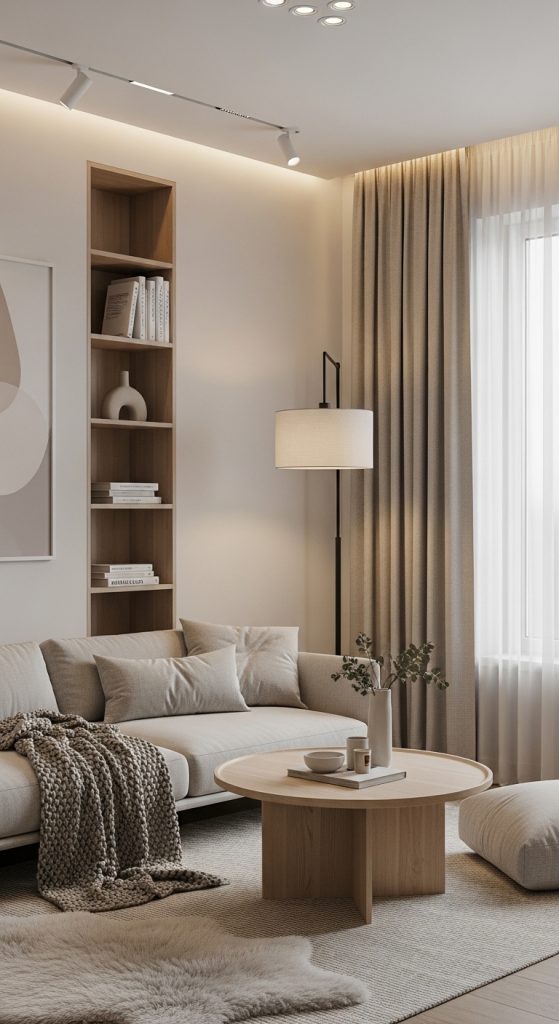 Choose colors such as beige, white, or soft gray. Apply these tones to furniture, textiles, and decor. Maintain consistency throughout the space. This design supports a minimalist and modern aesthetic.
