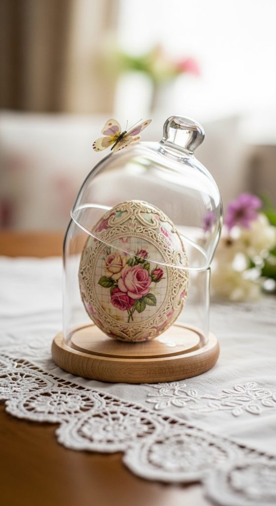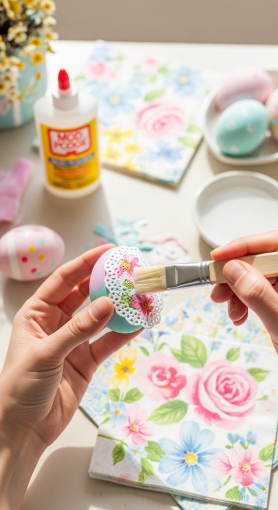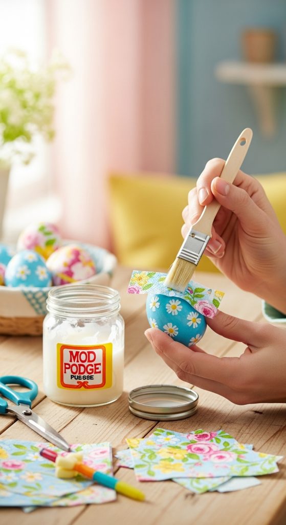 You can use floral napkins, scrapbook paper, or printed tissue paper. The layered paper effect gives the eggs depth and artistic charm. Display them in a glass cloche or as part of a spring mantel setup.