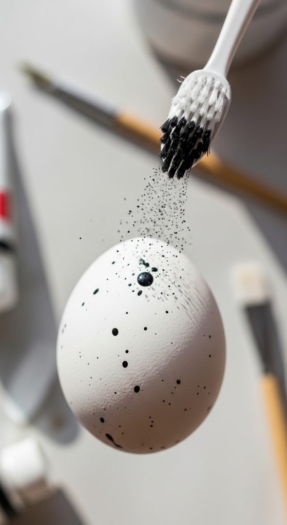 To create the speckled effect, dip an old toothbrush into watered-down black acrylic paint. Use your finger to flick the bristles gently, creating small speckles across the egg surface. Let dry completely.