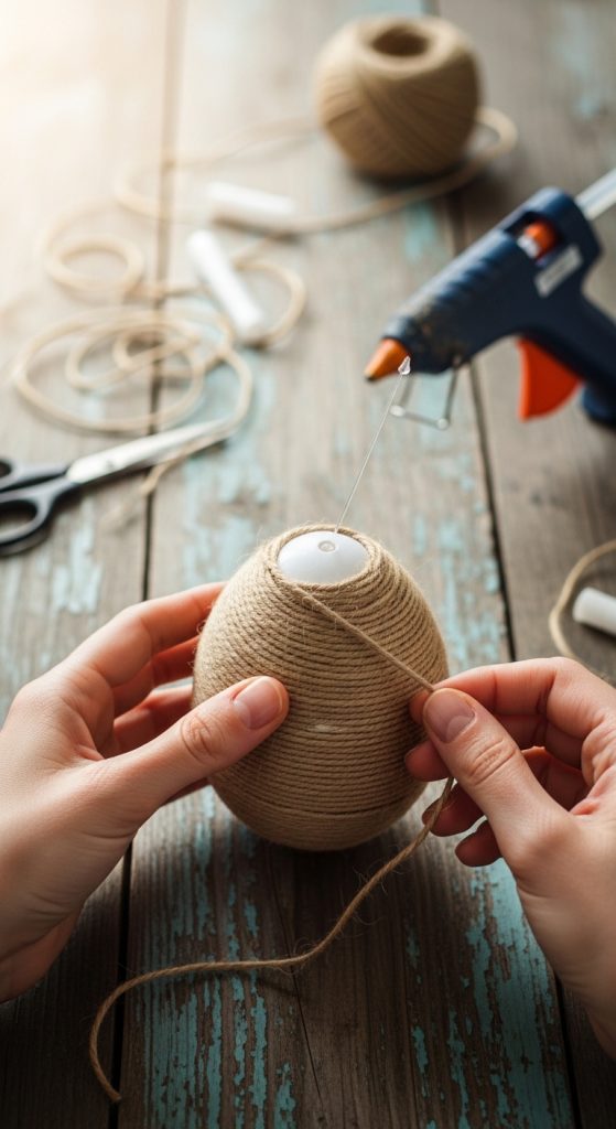 These eggs look high-end, especially when styled in a wooden bowl or on a distressed tray. You can keep them plain for a minimal aesthetic or add small wooden crosses, lace accents, or mini greenery sprigs for extra charm. Because the base egg is lightweight, wrapping it in twine is easy and doesn’t require complicated tools.