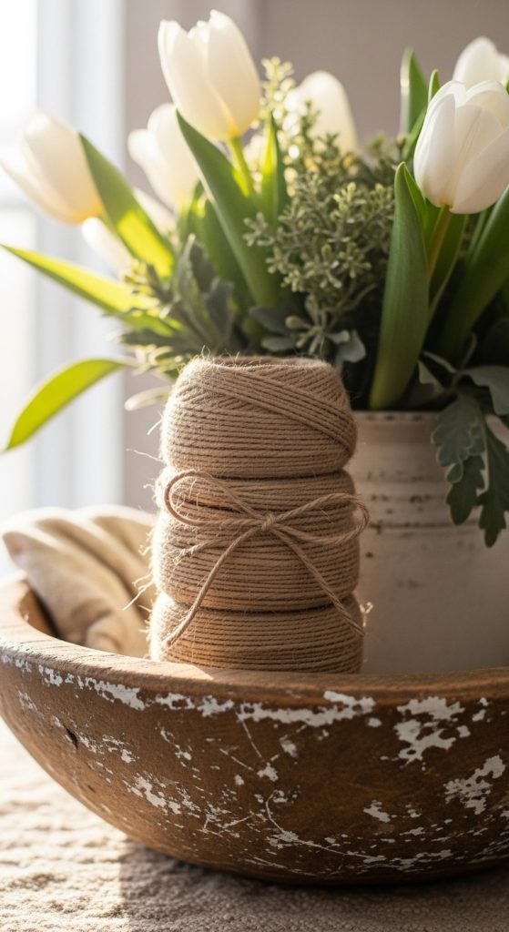 If you love cozy farmhouse vibes, this idea is a must-save. Twine-wrapped eggs instantly create warmth and texture, making them perfect for tiered trays, entryway tables, or dining room centerpieces. The natural rope texture gives the eggs a handcrafted, organic feel that pairs beautifully with wood beads, white florals, and neutral tones.