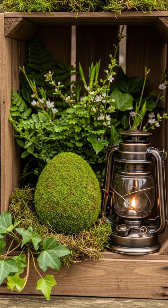 For a natural outdoor-inspired look, moss-covered eggs bring texture and earthy charm. These are perfect for garden-themed tablescapes or outdoor spring décor.