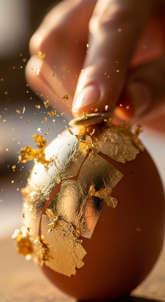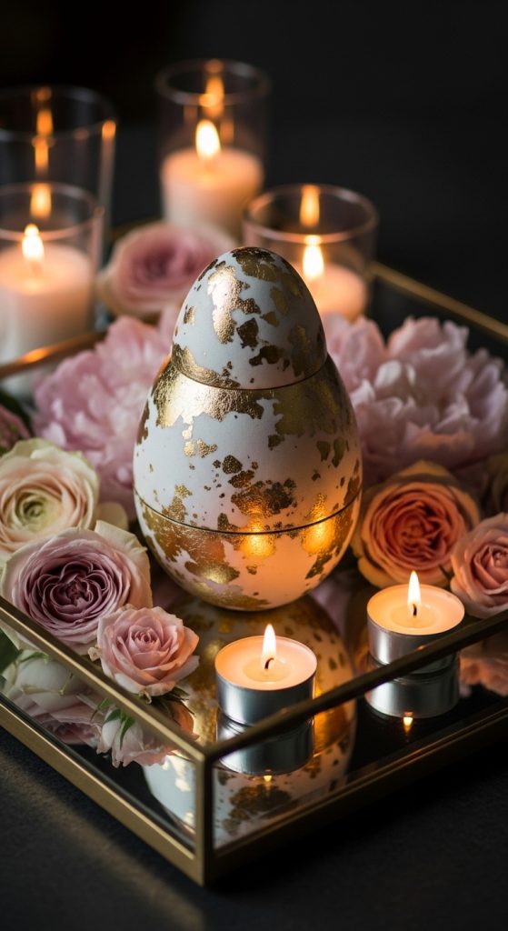 If you prefer a glamorous aesthetic, gold leaf eggs will instantly add elegance to your space. They look luxurious when paired with mirrored trays, candles, or blush florals.