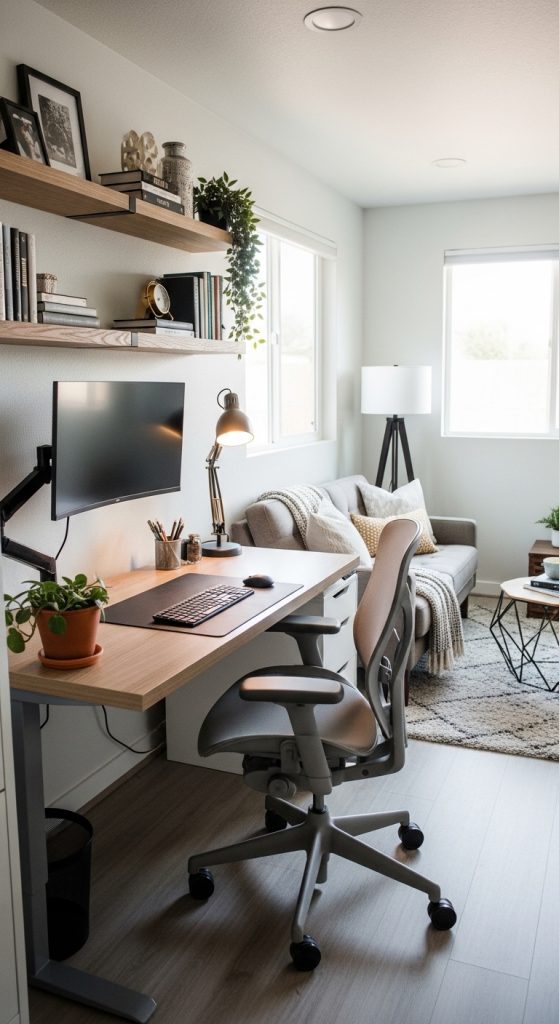 Designate a specific area for a desk and storage. Ensure adequate lighting and ventilation. Use compact furniture to save space. This setup supports productivity and comfort.