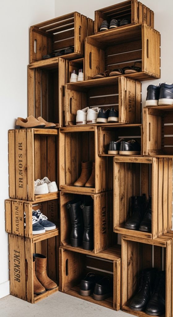 To create this system, use wooden crates and stack them securely or mount them to a wall. Sand the surfaces and ensure stability. Arrange crates in a pattern that fits the available space. Place shoes inside each crate based on category. This method provides a flexible and beginner friendly storage solution.