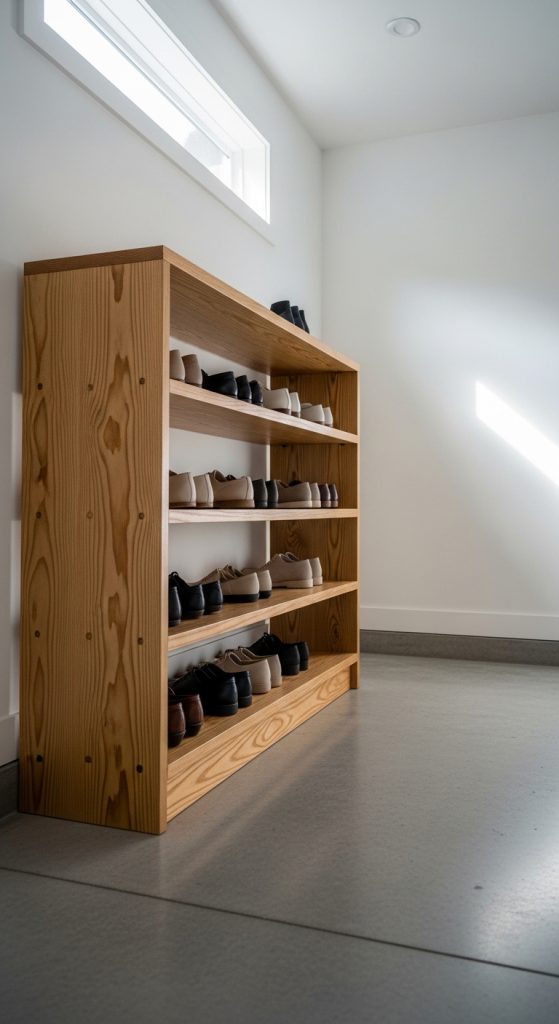 A tiered wooden shoe rack is a structured storage solution designed to hold multiple pairs of shoes in a vertical arrangement. This design uses stacked horizontal shelves to maximize space while maintaining clear visibility of each pair. The tiered format supports organization by separating shoes into levels based on type or frequency of use. This approach helps maintain a clean layout and prevents shoes from piling up on the floor. The design fits well within modern design and minimalist style preferences, as it emphasizes clean lines and simple structure. It is suitable for garages of all sizes because the height and width can be adjusted according to available space. This system improves accessibility and ensures that shoes remain organized and easy to locate. It also protects footwear from damage caused by stacking or improper storage.
