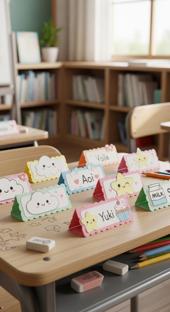 Create a folded name card using cardstock. Write your name neatly and decorate with cute characters or faces.