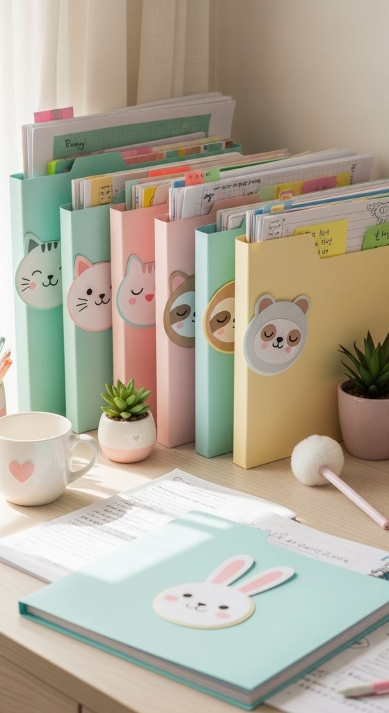 Use colored paper to create simple folder sleeves. Decorate the front with cute animals, faces, or pastel designs.