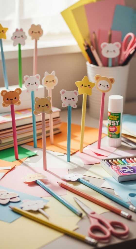 Cut out small shapes like stars, animals, or characters. Fold or glue them into a small loop that fits around the pencil. Draw cute faces and add blush for expression.