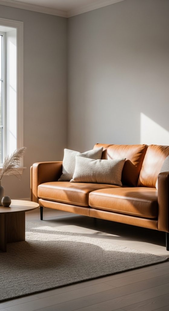 Neutral cushion layering focuses on adding soft textures and subtle color variations to a leather couch. This method enhances comfort while maintaining a clean and balanced aesthetic. Neutral tones such as beige, cream, and light gray work effectively with leather surfaces, creating a cohesive look. The concept involves arranging cushions in a structured manner to avoid clutter. This approach supports minimalist style principles while still adding depth to the seating area. The layering technique also improves usability by providing additional support for seating.