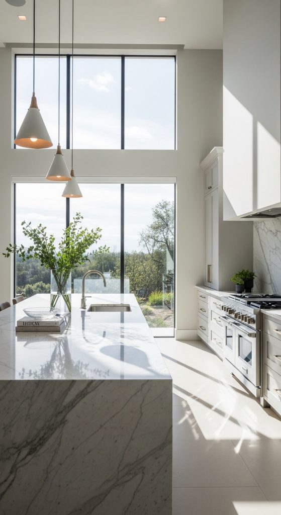 Large windows are commonly used in luxury kitchens to introduce natural light and improve spatial openness. Natural light enhances the appearance of materials such as stone countertops and wood cabinetry.