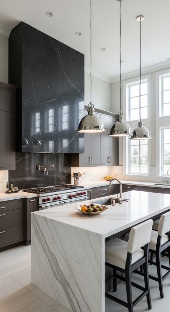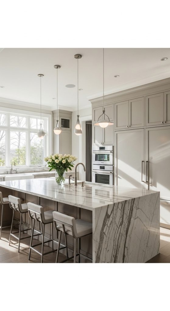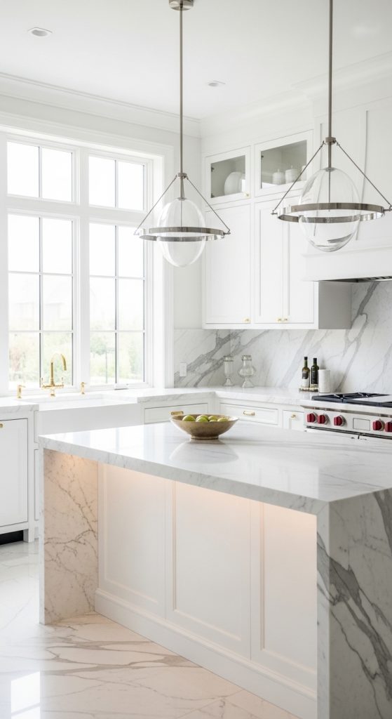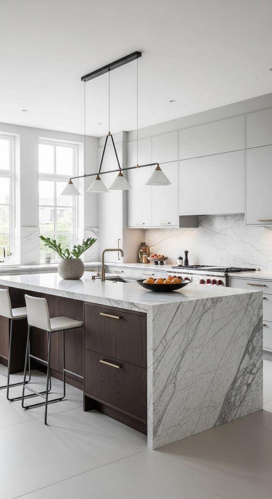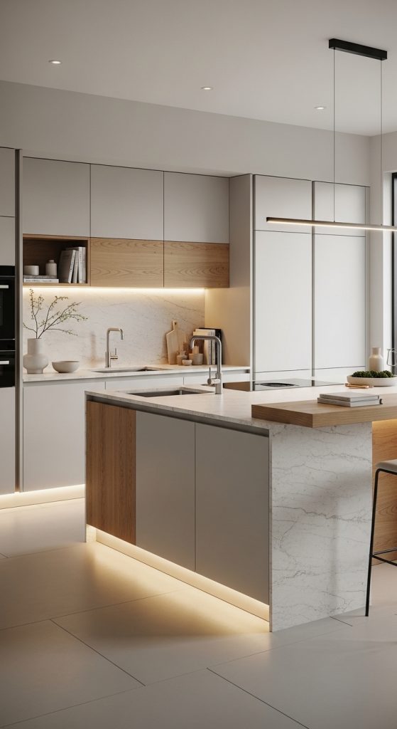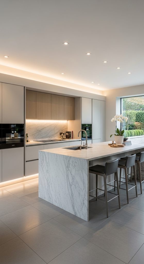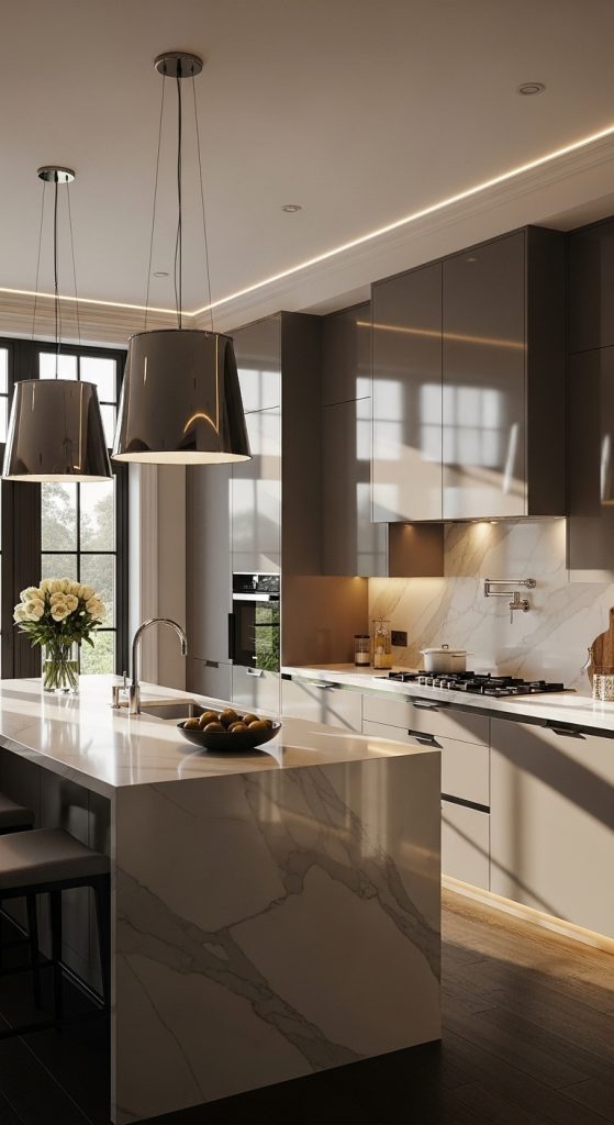 This design approach focuses on both functionality and decoration. By integrating marble surfaces with organized storage systems and structured lighting, the kitchen becomes both efficient and visually refined.