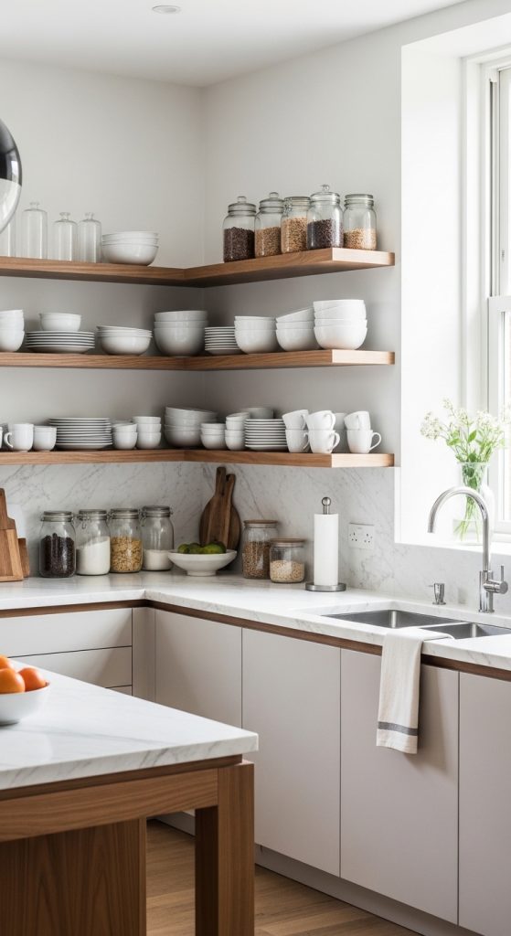 Pinterest inspiration often highlights open shelves with neatly arranged dishware, jars, or decorative objects. This arrangement combines organization with subtle decoration.