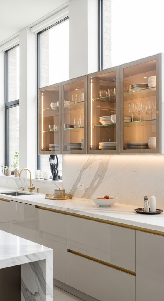 Glass display cabinets introduce visual depth and elegance to luxury kitchen interiors. Unlike solid cabinets, glass-front storage allows selected items to remain visible while still protected from dust and damage. This design is frequently featured in Pinterest kitchen inspiration because it combines storage with decorative presentation.