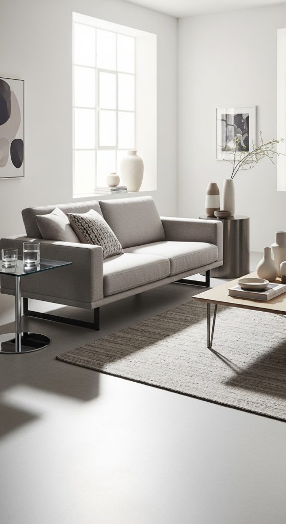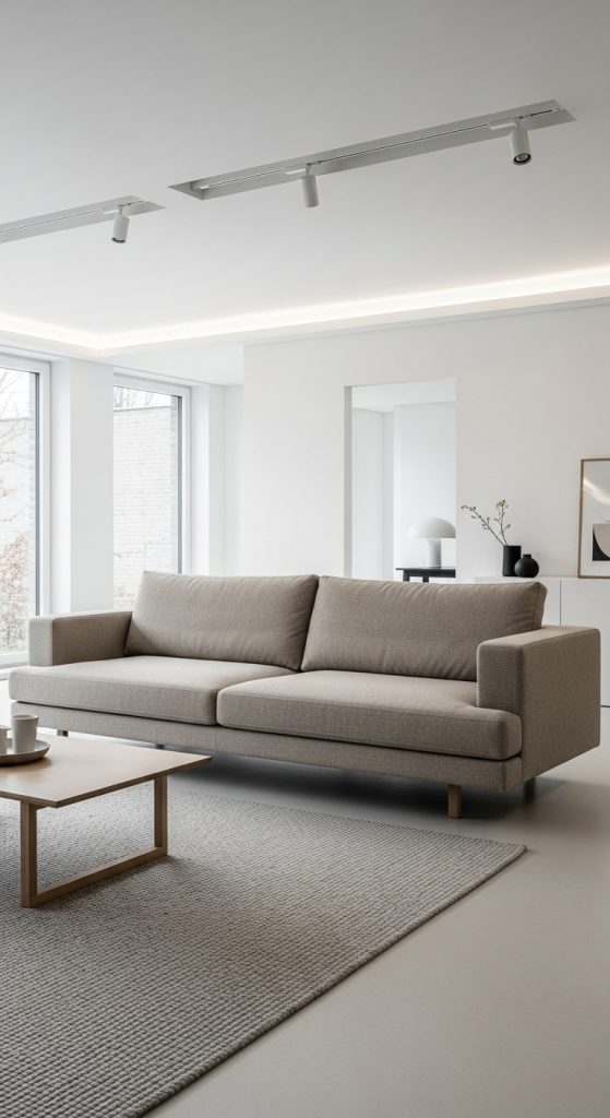 A minimalist low-profile sofa sits closer to the ground and features clean, straight lines with minimal detailing. It often comes in neutral colors like white, beige, gray, or taupe.