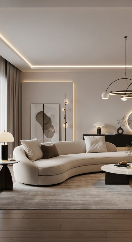 Curved sofas feature rounded edges and soft silhouettes, breaking away from traditional straight-lined designs.
