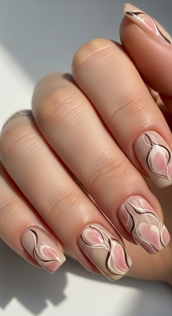 Soft pink tones provide a gentle and warm base for floral designs. This style enhances the natural appearance of the nails.