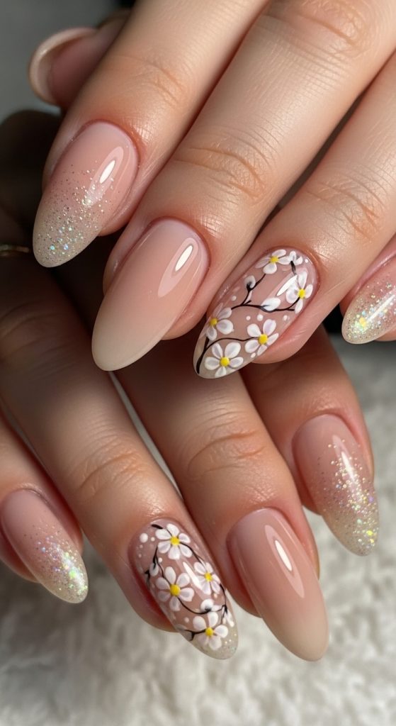 Apply a neutral base and add a light layer of glitter. Create floral designs using a fine brush. Seal with a top coat. This method creates a soft sparkle effect.