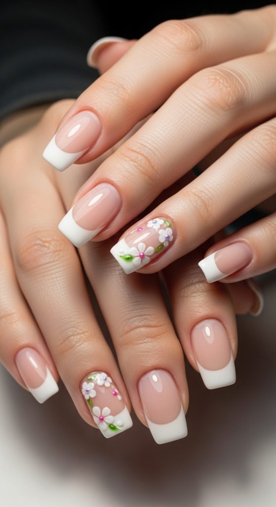 This style combines a classic French tip with floral detailing for added interest. The neutral tones maintain simplicity.