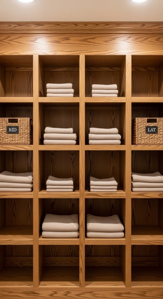 A built-in wooden cubby system maximizes vertical storage while maintaining rustic aesthetics. Cubby units divide the closet into equal sections, making it easier to categorize towels, toilet paper, and daily essentials. Begin by measuring the interior dimensions of the closet carefully. Cut plywood panels to form vertical dividers and horizontal shelves. Secure each piece with wood screws and brackets for structural stability. Sand all surfaces to ensure smooth edges and apply a stain that highlights the wood grain. Seal with moisture-resistant coating to prevent humidity damage. Each cubby can be customized to specific storage needs. Larger compartments accommodate folded bath sheets, while smaller sections store toiletries in baskets. The defined grid layout reduces clutter by assigning clear zones for every item. This organization method is particularly helpful for shared bathrooms. Labeling baskets within cubbies improves accessibility. The symmetrical arrangement supports minimalist style while preserving rustic warmth through visible wood texture. This design works well for DIY enthusiasts seeking an easy project with measurable results. The structured approach enhances both functionality and visual balance, aligning with trending Pinterest ideas focused on organization and practical home improvement.