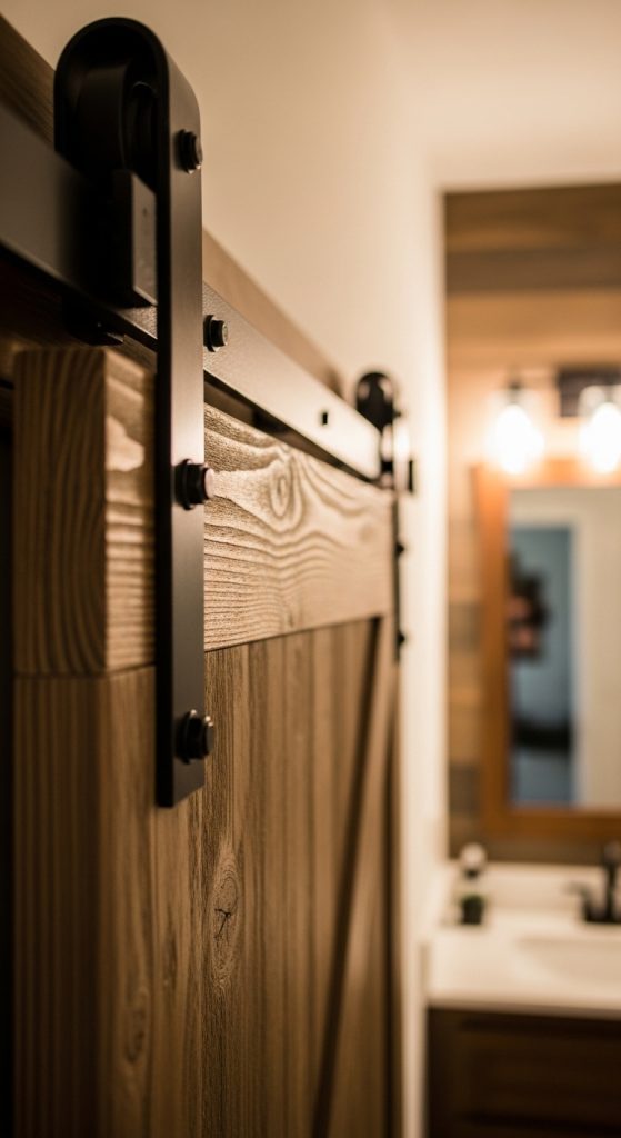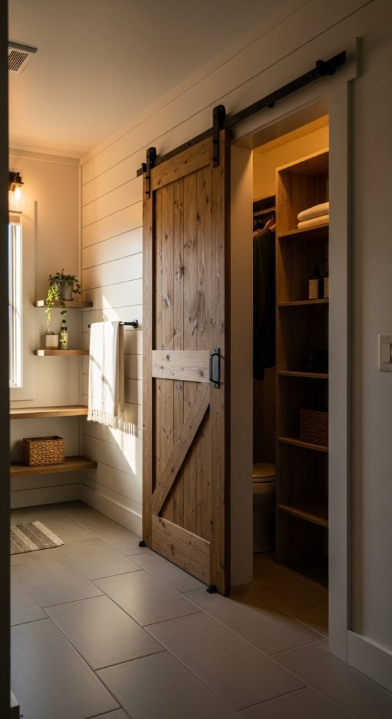 A sliding barn door transforms a standard bathroom closet into a statement feature. This method replaces traditional hinged doors with a horizontal sliding system mounted above the closet opening. The rustic style relies on solid wood panels, visible metal track hardware, and matte finishes. Begin by measuring the closet opening and selecting a wood panel that extends slightly beyond the frame for full coverage. Sand and stain the surface to match surrounding decor. Attach metal rollers to the top edge according to manufacturer spacing guidelines. Install the track securely into wall studs, ensuring it is level for smooth movement. The sliding function saves space in compact bathrooms while introducing farmhouse character. Inside the closet, maintain organized shelving to complement the exterior design. This setup works particularly well in minimalist or modern rustic interiors where texture becomes the focal point. The barn door not only conceals storage but also enhances visual interest. Proper installation ensures quiet operation and long term durability. This Pinterest inspired project merges decorative design with structural practicality, making it an efficient upgrade for bathrooms needing both aesthetic enhancement and functional improvement.