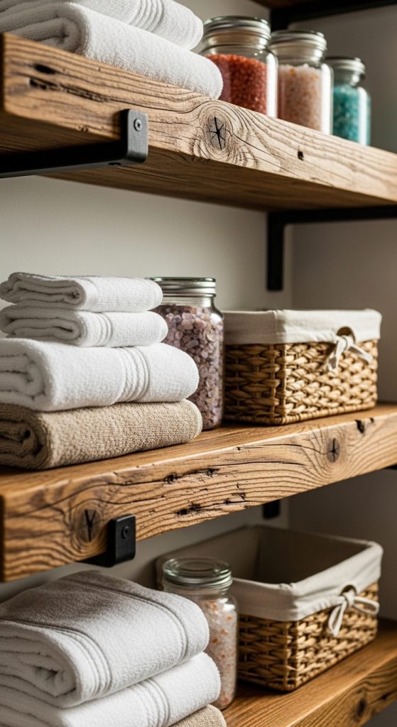 Floating shelves create a streamlined rustic bathroom closet with clean lines and open visibility. Install thick wooden planks directly onto hidden wall brackets for a seamless appearance. Measure vertical spacing carefully to accommodate towel stacks and storage containers. Secure brackets into studs for weight support. Sand and stain wood surfaces to highlight grain texture. Apply a waterproof sealant to protect against humidity. The floating design reduces visual heaviness while maximizing usable height. Arrange items evenly to maintain balance. Keep heavier objects on lower shelves to prevent strain. The absence of visible supports creates a minimalist yet rustic look. This approach works well in narrow closets where depth is limited. It allows clear organization and easy cleaning access. The layered shelf stack transforms unused vertical wall space into functional storage. As a beginner friendly DIY project, it requires precision but remains achievable with basic tools. This structure blends aesthetic simplicity with efficient organization.