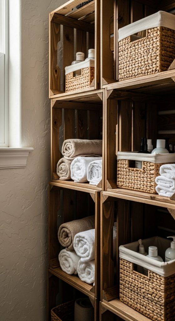 Wooden crates offer modular flexibility for rustic bathroom closet organization. Select sturdy crates with solid bases. Sand edges and apply stain to achieve consistent color. Stack crates vertically or horizontally depending on closet width. Secure them together using screws for stability. This modular method allows rearrangement as storage needs change. Each crate functions as an independent compartment. Use larger crates for towels and smaller ones for toiletries. The open front design ensures easy access. Lining crates with fabric softens appearance while protecting contents. The stacked configuration maximizes space without permanent installation. This DIY tutorial supports creativity while maintaining order. The raw wood texture enhances rustic character. This approach is budget conscious and adaptable for various closet sizes. Its flexibility makes it suitable for evolving household storage requirements. Modular crates align with Pinterest inspiration focused on practical organization and handmade solutions.