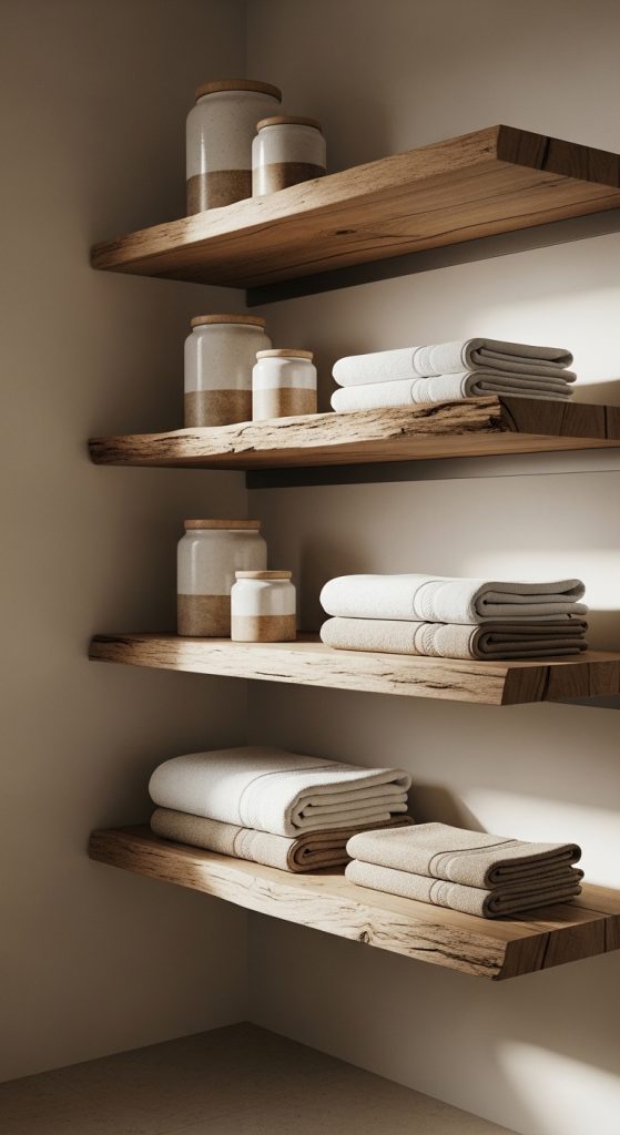 Corner shelves optimize overlooked areas within a bathroom closet. Measure corner angles precisely before cutting triangular wooden shelves. Sand edges and stain to match other wood elements. Install each shelf using strong corner brackets secured into studs. Position shelves evenly for balanced appearance. This design transforms dead space into functional storage. Smaller items such as folded washcloths or decorative containers fit efficiently on triangular surfaces. The layered arrangement increases vertical capacity. Ensure sealant application to protect against humidity. Corner shelving works particularly well in compact closets where width is limited. The angled layout creates depth and architectural interest. This solution supports organization without reducing walking space. It represents a practical and aesthetic rustic bathroom closet idea suitable for step by step DIY execution.