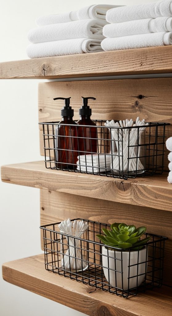 Combining wood shelves with black wire baskets introduces texture contrast while maintaining rustic cohesion. Install sturdy wooden shelves using metal brackets for support. Position wire baskets directly on the shelves to contain smaller bathroom essentials. This design improves visibility and prevents clutter from spreading across flat surfaces. Choose baskets with open grid patterns for easy identification of contents. Line baskets with fabric inserts to prevent smaller items from slipping through gaps. This setup method supports both airflow and accessibility. Wire elements add an industrial edge while wood maintains warmth. Organize items by category within each basket to streamline daily routines. Towels can remain folded on open shelf space above or below baskets. The mix of materials produces visual interest without overwhelming the closet interior. The structure remains simple and beginner friendly, requiring only accurate measurements and secure mounting. This approach aligns with Pinterest trends focused on organization and aesthetic balance. It demonstrates how combining two contrasting materials can elevate a practical storage solution into a cohesive rustic design feature.