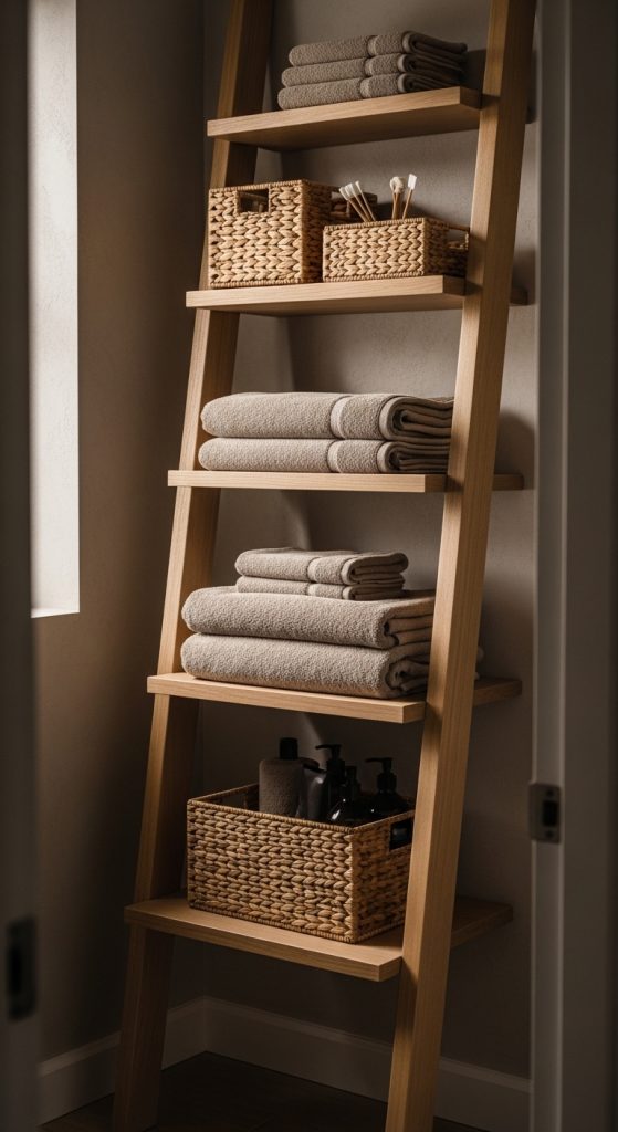 A ladder shelf insert introduces a flexible storage solution without permanent installation. This design features a leaning wooden ladder frame with gradually widening shelves toward the bottom. To create this structure, cut two long wooden boards for side supports and attach horizontal planks at angled positions. Secure joints with wood glue and screws. Sand thoroughly and apply a natural stain for warmth. Place the ladder inside the closet, leaning it securely against the back wall. The open design allows airflow, reducing moisture buildup. Upper shelves store lightweight items such as rolled towels, while lower levels support heavier baskets. This system works well in rental spaces because it does not require wall drilling. The tapered shelf spacing creates visual depth and layered organization. Adding woven bins enhances texture while maintaining a cohesive rustic aesthetic. This creative project balances storage with decorative appeal. It provides flexibility in arrangement and can be repositioned easily. As a beginner friendly tutorial idea, the ladder shelf supports modern design preferences while remaining grounded in natural materials. Its simple structure and adaptable layout make it a practical addition to many bathroom closet configurations.