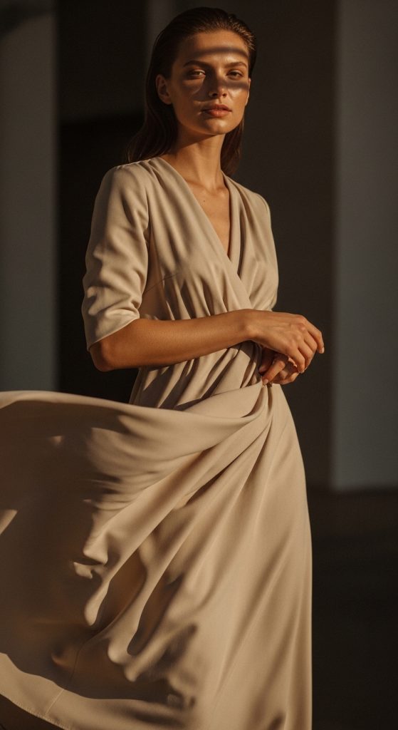 To create this outfit step by step, start by selecting a lightweight midi dress made from breathable materials such as cotton or linen. Ensure the fit allows movement without being overly loose. Pair the dress with neutral footwear such as sandals or simple flats. Add minimal accessories, such as a thin belt to define the waist or small jewelry pieces to enhance the look without overwhelming it. Keep colors consistent within the beige palette to maintain cohesion. This easy project requires minimal preparation and is ideal for quick outfit planning. The simplicity of this setup ensures that it can be repeated efficiently while maintaining a polished appearance.