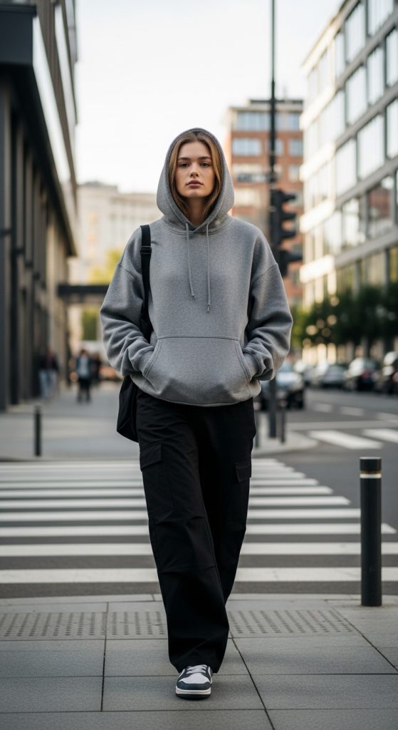 A hoodie paired with cargo pants creates a tomboy outfit that emphasizes practicality and durability. Cargo pants are characterized by their relaxed fit and functional pockets, which align naturally with the utilitarian aspects of tomboy fashion. To create this outfit, begin with a comfortable hoodie made from fleece or cotton fabric. The hoodie should have a relaxed shape that allows layering and easy movement. Neutral colors such as black, gray, or olive often support the aesthetic because they maintain a simple color palette. Combine the hoodie with cargo pants that feature straight or slightly loose legs. The pocket details on cargo pants introduce texture and functional design elements that distinguish the outfit from more minimal styles. Footwear typically includes sneakers or durable boots that match the practical nature of the clothing. Because the outfit already includes strong structural elements, accessories should remain minimal. A cap or backpack can provide additional functionality without adding unnecessary decoration. This outfit works particularly well for travel, outdoor activities, or casual urban environments where comfort and mobility are priorities. The combination of durable fabrics and relaxed silhouettes demonstrates the core principles of tomboy styling, which explains why hoodie and cargo pant outfits frequently appear in Pinterest fashion inspiration collections.