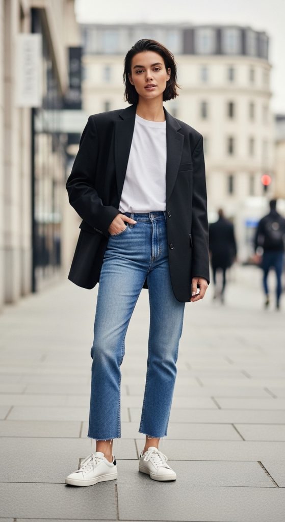 A loose blazer combined with a T-shirt and jeans introduces a more structured version of the tomboy aesthetic. The blazer adds a tailored element that contrasts with the relaxed nature of the other clothing pieces. To create this outfit, begin with a simple cotton T-shirt that serves as the base layer. The shirt should remain plain and comfortable to maintain the minimalist tone of the outfit. Next, add a loose or slightly oversized blazer made from structured fabric. The blazer introduces clean lines that frame the upper body and elevate the casual foundation of the outfit. Pair these layers with straight-leg or relaxed jeans to maintain balance between structure and comfort. Footwear options include sneakers, loafers, or simple boots depending on the desired environment. Accessories should remain minimal so the clothing layers remain the primary focus. A small backpack or belt can provide subtle visual structure without disrupting the tomboy aesthetic. This outfit demonstrates how structured garments can integrate into relaxed clothing combinations. Pinterest fashion inspiration often highlights similar looks because they combine casual elements with tailored shapes, creating versatile outfits suitable for multiple environments.