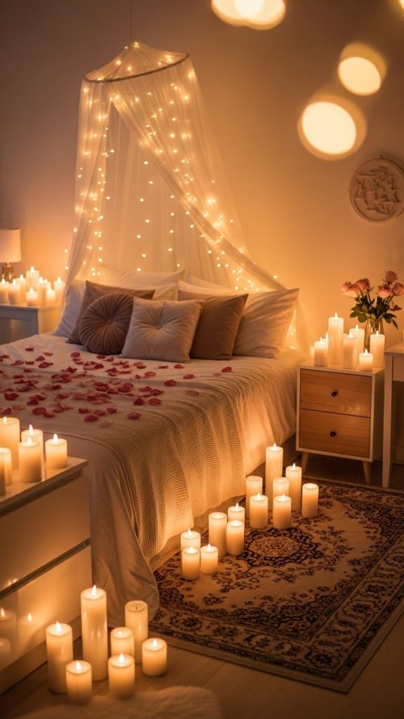 Scented candles add another emotional layer. Soft fragrances like rose, vanilla, or lavender enhance the romantic atmosphere and make the space feel comforting. However, it’s important not to overpower the room—subtle scents work best.