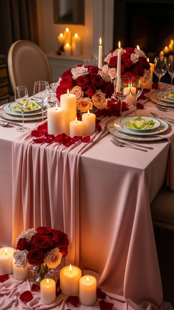 Start with a table runner or cloth in soft colors like blush, white, or red. Layer it with plates, glassware, and napkins that feel cohesive. Candles placed in the center create warmth and elegance.
