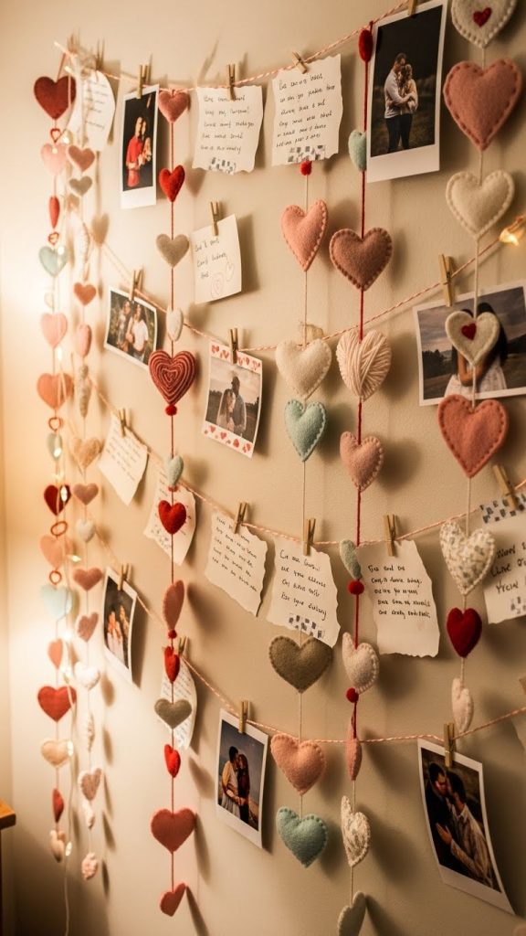 Garlands made of hearts, photos, or notes can be hung above beds, sofas, or dining areas. Writing reasons you love someone on small cards adds emotional value.
