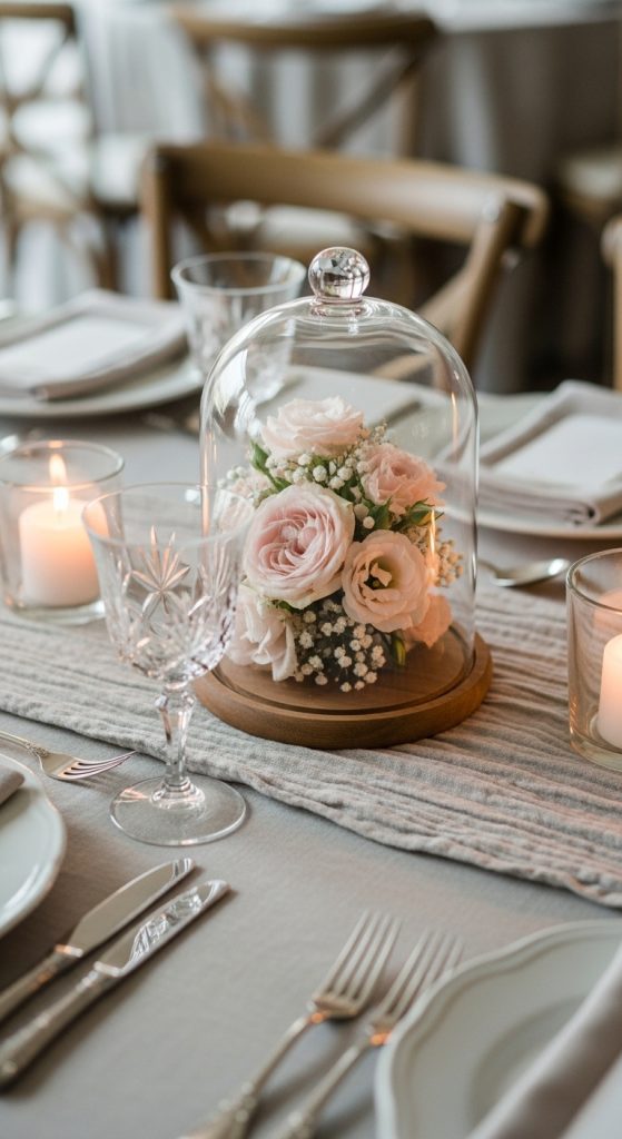 Glass cloches create enclosed decorative displays that protect delicate items. Place floral arrangements, candles, or small decorative accents inside each dome. Use wooden or mirrored base for stability. Keep interior arrangement simple to prevent visual clutter. The dome enhances focus on enclosed element while maintaining transparency. Position one cloche per table center. This style works well for vintage or romantic themes. Ensure dome height aligns with guest sightlines. Clean surfaces thoroughly before placement. This centerpiece approach adds architectural interest while remaining cohesive with other glass decor elements.