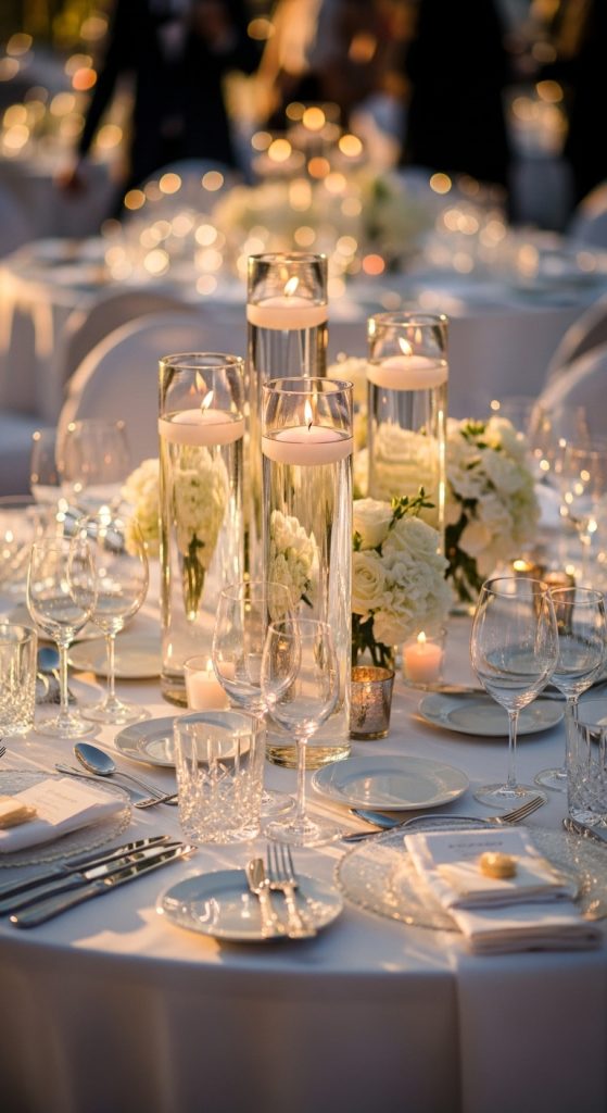 Floating candle centerpieces use tall glass cylinders filled with water and topped with floating candles. This design creates vertical elegance without blocking guest conversation. Begin by selecting cylinders between 20 and 35 centimeters in height. Fill each cylinder three-quarters with clean water. Add decorative elements such as clear beads or submerged greenery stems to enhance depth. Place a floating candle gently on the surface. Keep arrangement height moderate to preserve visibility across the table. Space cylinders evenly at the center. The glass amplifies candlelight reflections, producing subtle glow suitable for both indoor and tented receptions. Ensure candles are evenly trimmed for balanced burn time. This idea works well for round tables and long banquet layouts when grouped in clusters. Beginners benefit from its simplicity and structured assembly. Proper spacing prevents overcrowding. The transparent design aligns with minimalist style decor while delivering warm ambiance that complements floral arrangements and table linens.